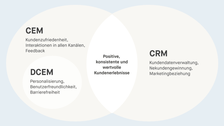Customer Relationship Management (CRM) und Customer Experience Management (CXM) haben das gleiche Ziel: loyale, wiederkehrende Kund:innen gewinnen und an die Marke binden. Ein effizientes Customer Relationship Management trägt dabei zu einer positiven Erfahrung bei, während eine positive Customer Experience natürlich auch die Kundenbeziehung fördert.